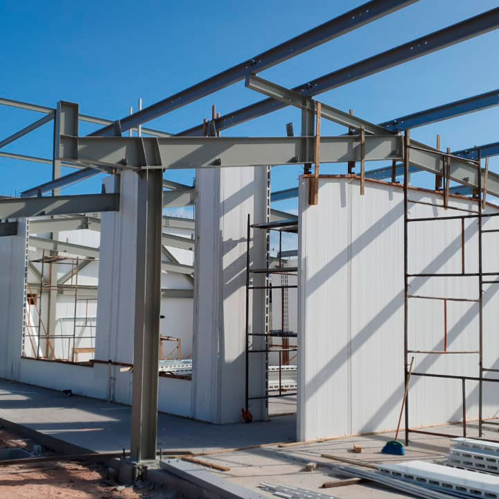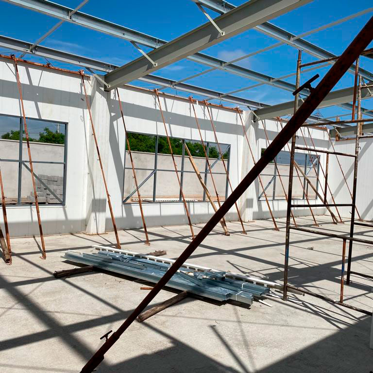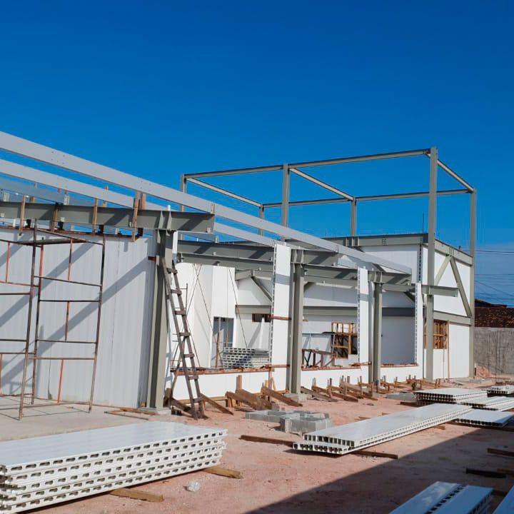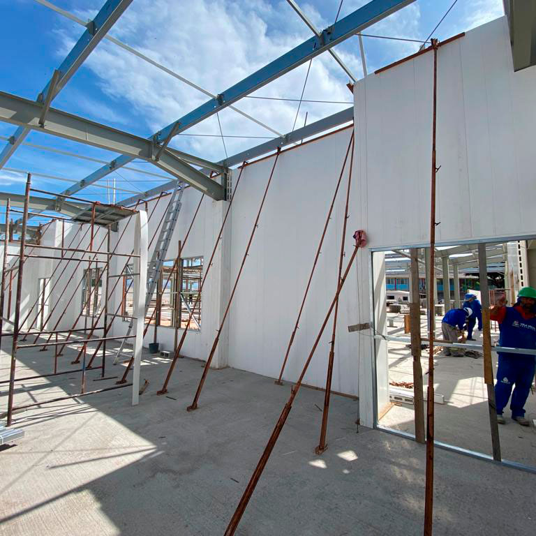 Construção de prédio em Tecnologia Inovadora "Concreto/PVC", método constritivo com montagem das paredes em perfis de painéis duplos com sistema de travamento vertical entre os perfis, instalação embutida de armadura, tubulação hidráulica e tubulação elétrica. Preenchimento dos perfis com "micro concreto" auto adensável, resultado em paredes "estruturais" revestidas de PVC, com características de acabamento final, conforto térmico e acústico.