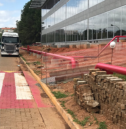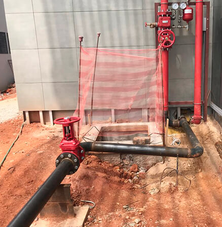 Execução de rede de água para sistema de combate a incêndio com hidrantes e sprinkles. Interligação aérea e subterrânea de tubulação em aço carbono Ø10" schedule 40.