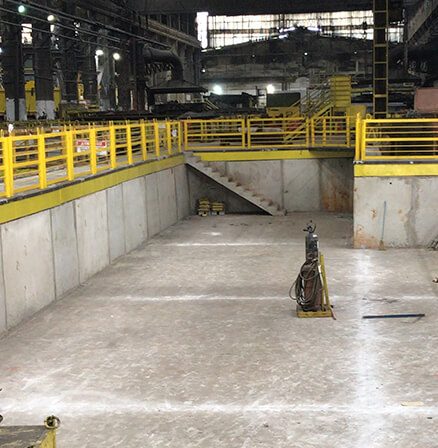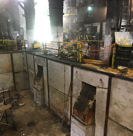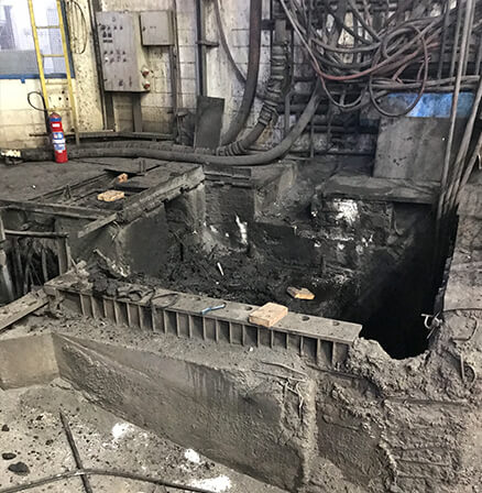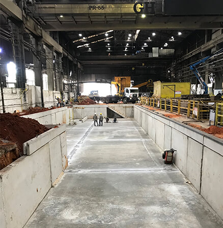 Reconstrução de fundação para Forno de Eletrofusão, com demolições, inserts metálicos e recomposição da estrutura de concreto armado, com utilização de concreto de alta resistência inicial e a temperaturas elevadas.