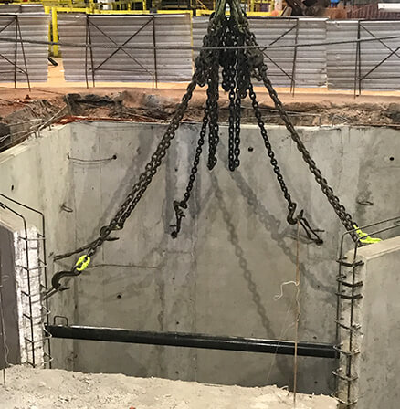 Execução de fosso em concreto armado pré fabricado, com montagem final dos elementos de concreto internamente a planta fabril (dificuldade de transporte e acesso). Instalação em cova com 5,0m de profundidade sem necessidade de contenção de terra.